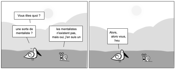 L'Oiseau questionne ☞ ☞ ☞ [1] — Vous êtes quoi ? une sorte de mentaliste ? — les mentalistes n'existent pas, mais oui, j'en suis un [2] — Alors, alors vous, heu